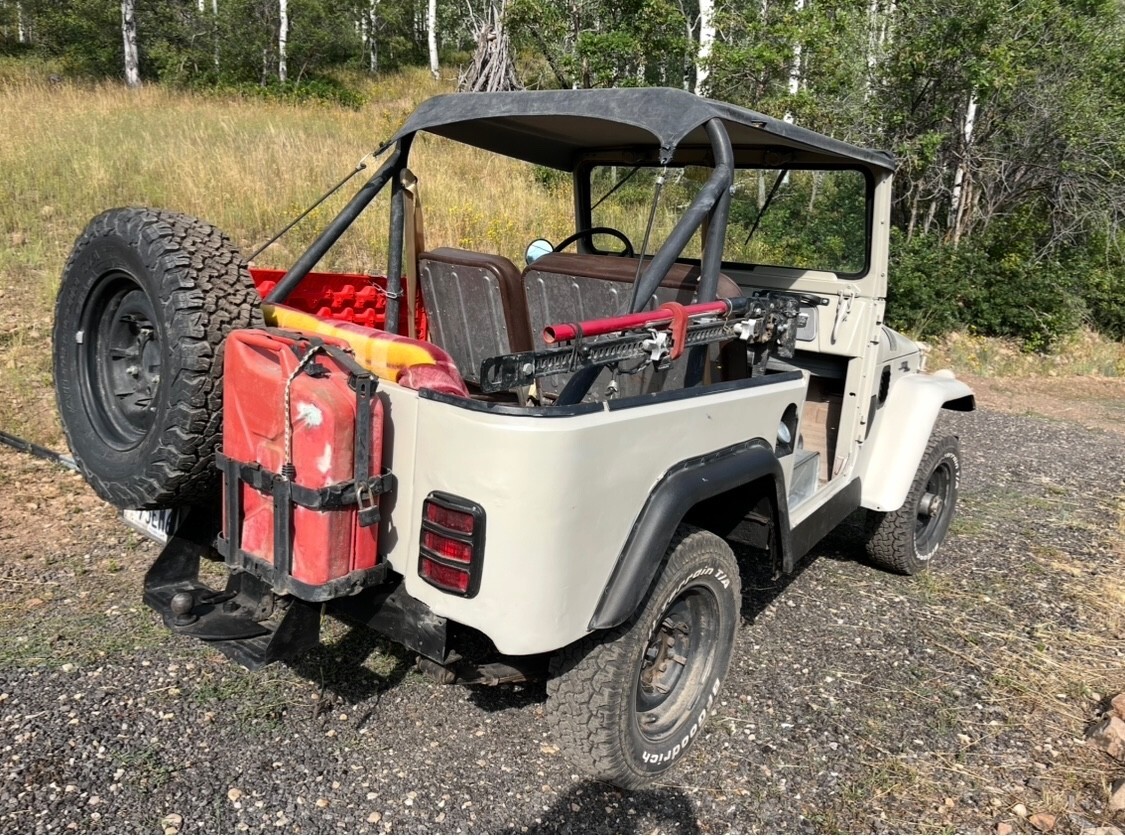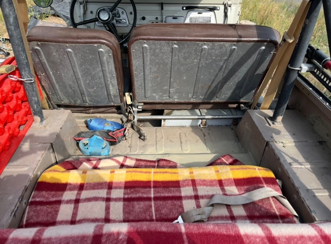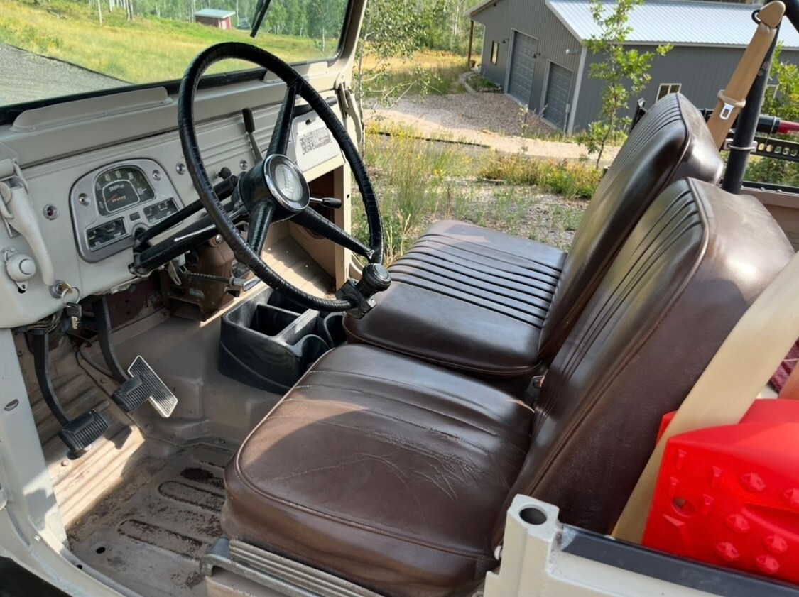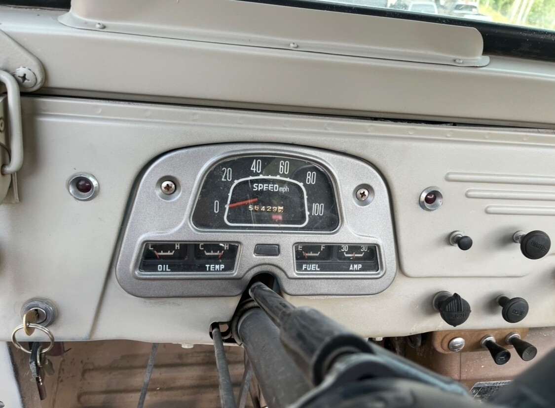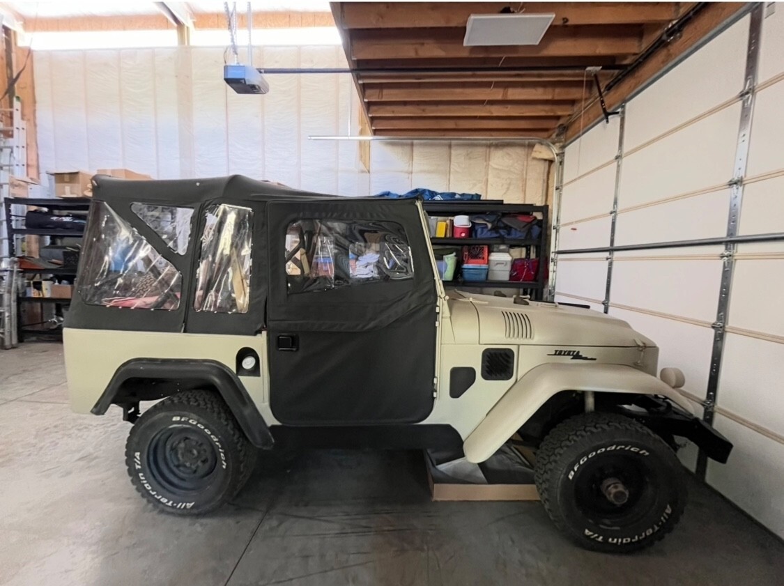 1966 Toyota Land Cruiser with 2F engine and 3spd column shift transmission. Odometer reads 58,000 but actual mileage unknown. Comes with new 2 piece soft doors, full soft top and bikini top. Has tow bar for easy towing.
