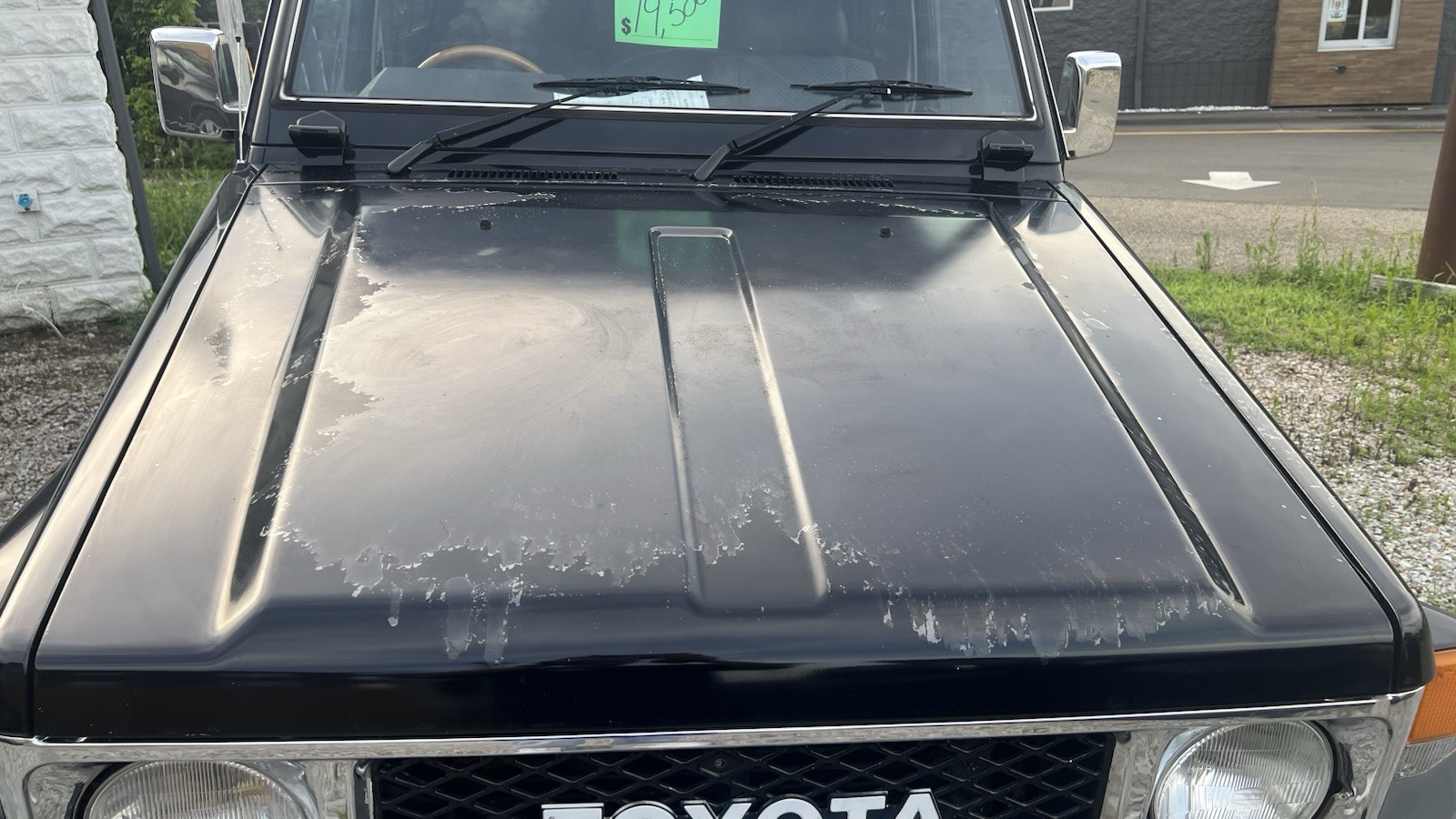 Fires up immediately, good strong motor. Drives well, sits on 33” tires. Roof detaches, windshield folds down, great off road truck. No rust. Hood and roof and sun faded with clear peeling