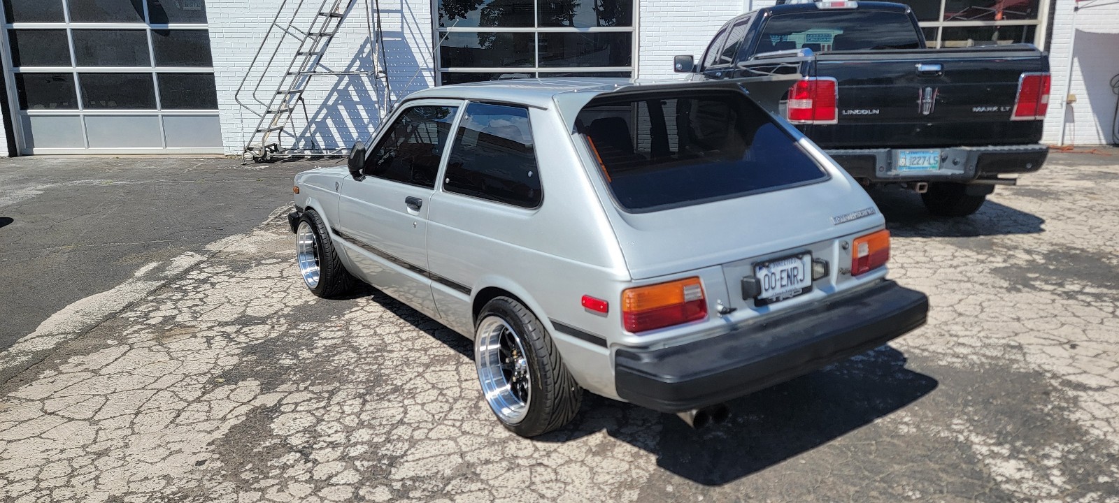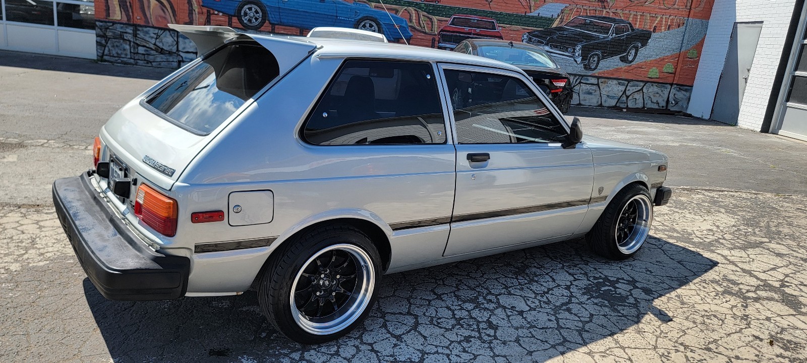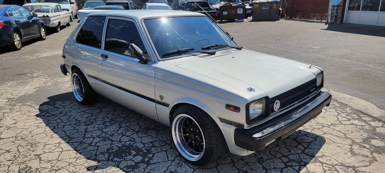 1981 toyota starlet kp61, stock 12a rotary engine/5 speed transmission, racing beat headers/intake, ae86 front suspension/brakes, front techno toy t3 coilovers. New rims/tires/brakes.