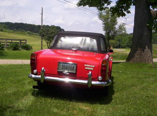 For sale is a restored 1968 Triumph TR 250. The TR 250 is a rare, imited edition Triumph, ade exclusively for the American market, f which only 1,800 units were produced. This car has been extensively restored to its original condition with only 385 miles on the engine since a complete mechanical overhaul. Mechanical work included, ut was not limited to, he following: New brakes New wheel cylinders, alipers & feeder hoses New master cylinder New tie rod ends New trunnions & bushings New upper ball joints New shock absorbers all around New exhaust, anifold back and muffler New alternator New spark plugs, ires & caps New set of tires And many more items too numerous to mention. Interior and detail items that have been replaced include: New top All new interior upholstery New Carpets New dash and dash padding All new emblems New side lights New tail lights The original toneau cover and boot cover are in good shape and are included in the sale along with a Triumph jack and some original tools. This car has great compression, oes not burn oil and is a reliable runner ready to take you wherever you want to go with the class and style guaranteed to turn heads. To make this rare Triumph a top notch show stopper and serious point winner it still needs a few details seen to. The horn doesn’t work, he emergency brake is frozen and the tachometer doesn’t work right. At some point in the past a patch was installed in the driver’s side floor and for complete originality you might want to replace the floor pan. That’s it. A little bit of TLC to take care of these items and this beauty becomes a serious gem. Comes with a clean Ohio title. Triumph TR 250s are routinely selling for between $25,000 and $45,000 but the reserve on this fine classic is set far, ar below its market value. I am selling this car for a friend who doesn’t do eBay, o if you have any questions I will pass them on to him and get back to you ASAP. This car is being sold as is, here is; no warranty is expressed or implied. A $500 nonrefundable deposit is expected within 48 hours of purchase. Balance of payment to be completed within ten days of the end of the auction. Seller requests balance of payment be made via cashier’s check or certified check. The seller can hold the car for up to 30 days without charge but no longer. If you need help with transportation the seller will do all he to accommodate you but transportation is ultimately the responsibility of the lucky buyer. On Jul-01-15 at 03:44:25 PDT, eller added the following information:For sale is a restored 1968 Triumph TR 250. The TR 250 is a rare, imited edition Triumph, ade exclusively for the American market, f which only 8,484 units were produced. This car has been extensively restored to its original condition with only 385 miles on the engine since a complete mechanical overhaul. Mechanical work included, ut was not limited to, he following: New brakes New wheel cylinders, alipers & feeder hoses New master cylinder New tie rod ends New trunnions & bushings New upper ball joints New shock absorbers all around New exhaust, anifold back and muffler New alternator New spark plugs, ires & caps New set of tires And many more items too numerous to mention. Interior and detail items that have been replaced include: New top All new interior upholstery New Carpets New dash and dash padding All new emblems New side lights New tail lights The original toneau cover and boot cover are in good shape and are included in the sale along with a Triumph jack and some original tools. This car has great compression, oes not burn oil and is a reliable runner ready to take you wherever you want to go with the class and style guaranteed to turn heads. To make this rare Triumph a top notch show stopper and serious point winner it still needs a few details seen to. The horn doesn’t work, he emergency brake is frozen and the tachometer doesn’t work right. At some point in the past a patch was installed in the driver’s side floor and for complete originality you might want to replace the floor pan. That’s it. A little bit of TLC to take care of these items and this beauty becomes a serious gem. Comes with a clean Ohio title. Triumph TR 250s are routinely selling for between $25,000 and $45,000 but the reserve on this fine classic is set far, ar below its market value. I am selling this car for a friend who doesn’t do eBay, o if you have any questions I will pass them on to him and get back to you ASAP. This car is being sold as is, here is; no warranty is expressed or implied. A $500 nonrefundable deposit is expected within 48 hours of purchase. Balance of payment to be completed within ten days of the end of the auction. Seller requests balance of payment be made via cashier’s check or certified check. The seller can hold the car for up to 30 days without charge but no longer. If you need help with transportation the seller will do all he to accommodate you but transportation is ultimately the responsibility of the lucky buyer.