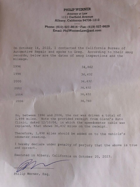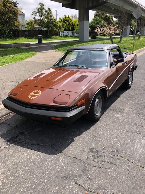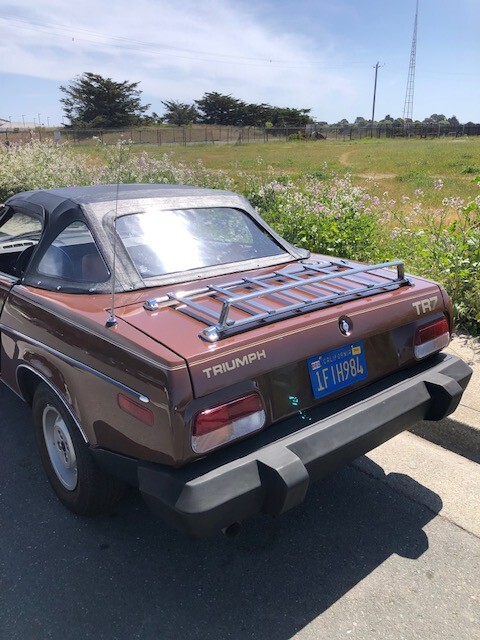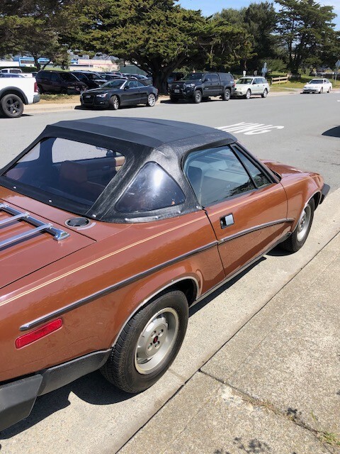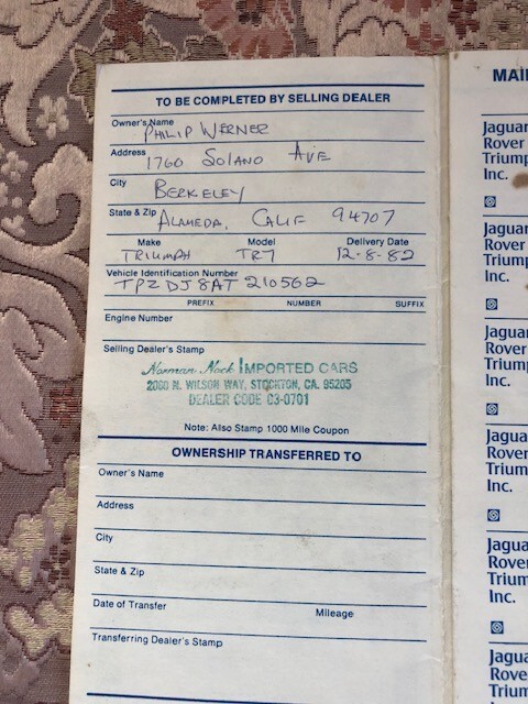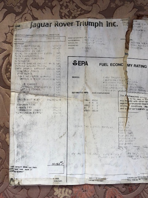 As the attached documents show, I am the original owner of this car. I bought it in 1982, from Norman Nock Motors in Stockton, California. Although I purchased the car in 1982, Norman still had a few 1980 TR's and Mg's on his lot. I wanted one with A.C. and he had one. Of interest, after I bought the car but before I took possession of it, Norman told me that the paint had flattened out a bit due to having been in the sun and the manufacturer decided to have it repainted before I received it. So this is the original paint that was on the car when I first took possession of it. It is still in good condition. This was my regular runner through 1985; I then purchased new a 1986 Chrysler LeBaron and put the TR in storage, driving it very seldom. Probably in 1997, the speedometer cable broke. Since I so rarely drove the TR, I had no reason to rush to replace the cable. Glenn, my mechanic, ordered three replacement cables before he found the correct one, which he installed on December 10, 2004 (copy receipt attached) showing 36,432 miles then on the car. As you can see from the odometer photo which I took today, it shows 37,177, so that in last 21 years, the car has been driven 745 miles. Based on DMV records, I calculated that during the time the speedometer cable was not working, the car had been driven a total of 1,898 miles. Recently, the TR had installed a new water pump, new accelerator cable, new radiator, new top, new OEM seat covers, and I had the alternator rebuilt. Car drives great! Of interest is that the California versions such as this one, all had fuel injection. None California versions had carburetors. Virtually everything works on the car, other than the clock, which works for a couple of days after I move the fuse around and then stops. Car is a real "head turner" and looks like it just left the showroom.