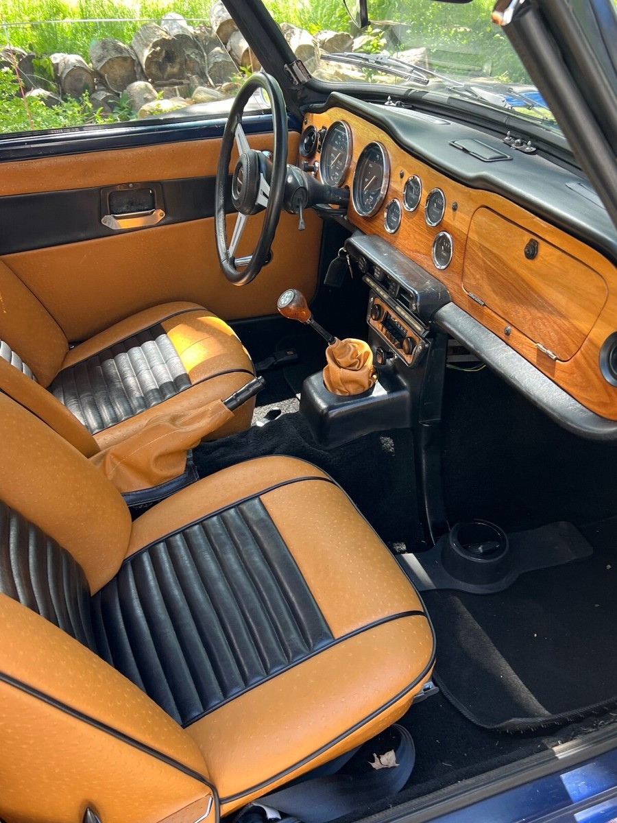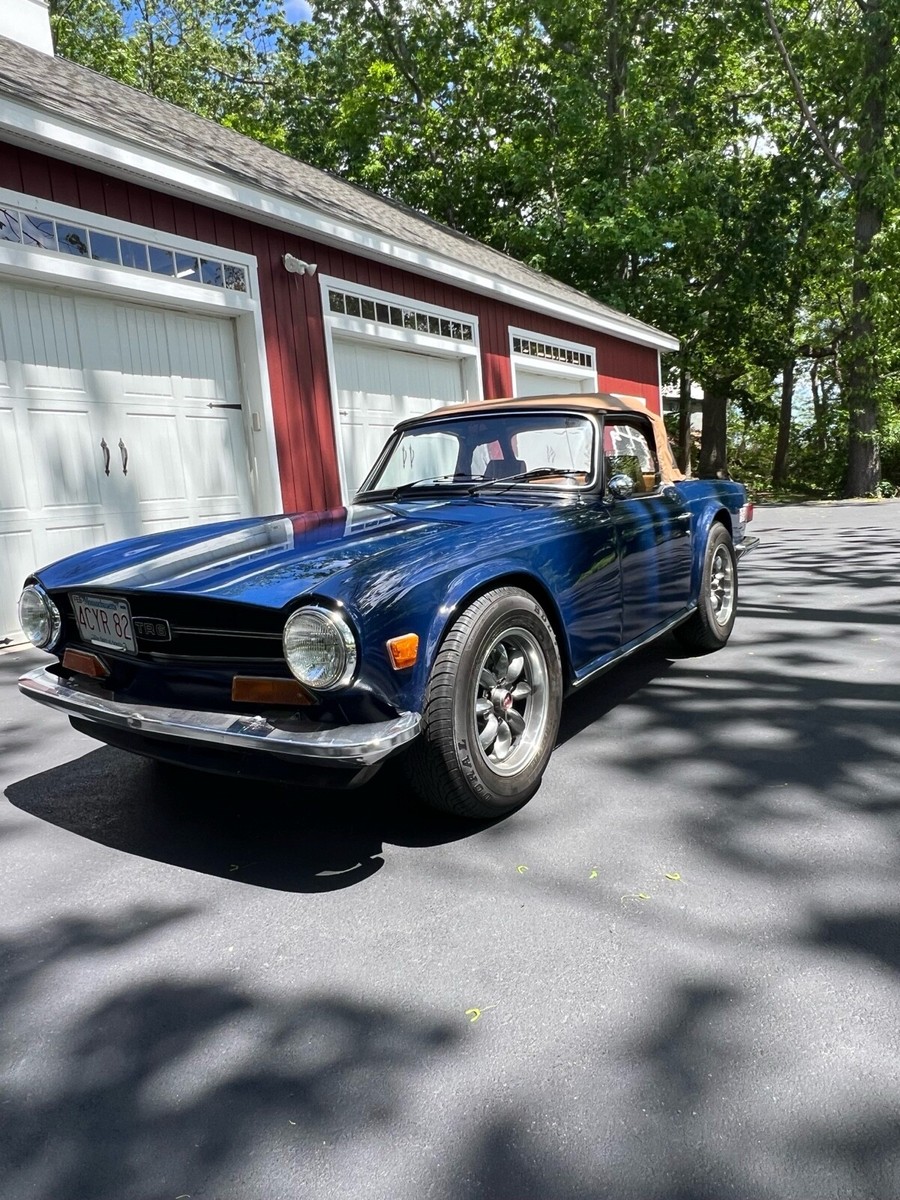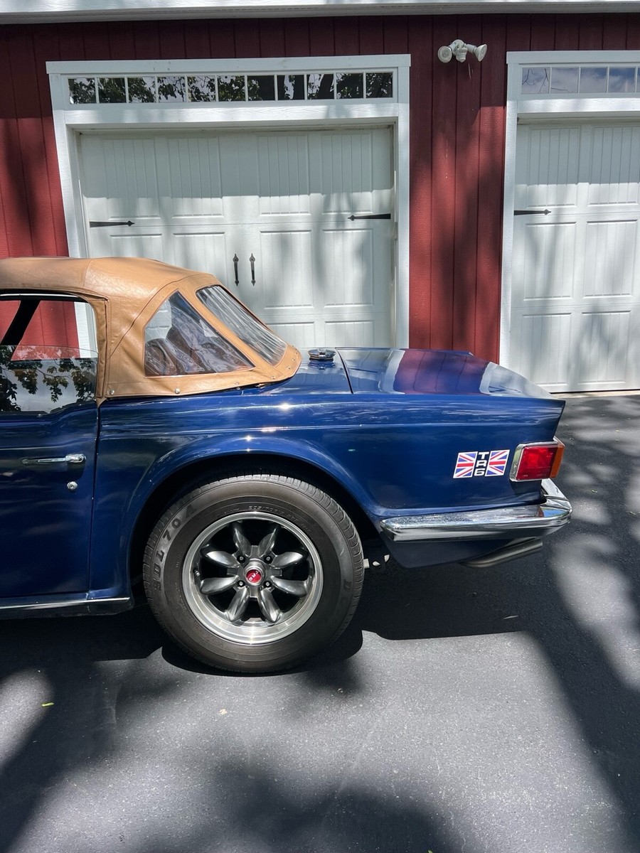 1974 Triumph TR6, 2.5 Liter(150 CI) Straight six, 12 Valve Front Disk brakes, Rear Drum, Duel Zenith Stromberg Carbs Rack and Pinion Steering, Walnut Dash, Weight 2,280 lbs, Sapphire Blue Exterior, 4 Speed,