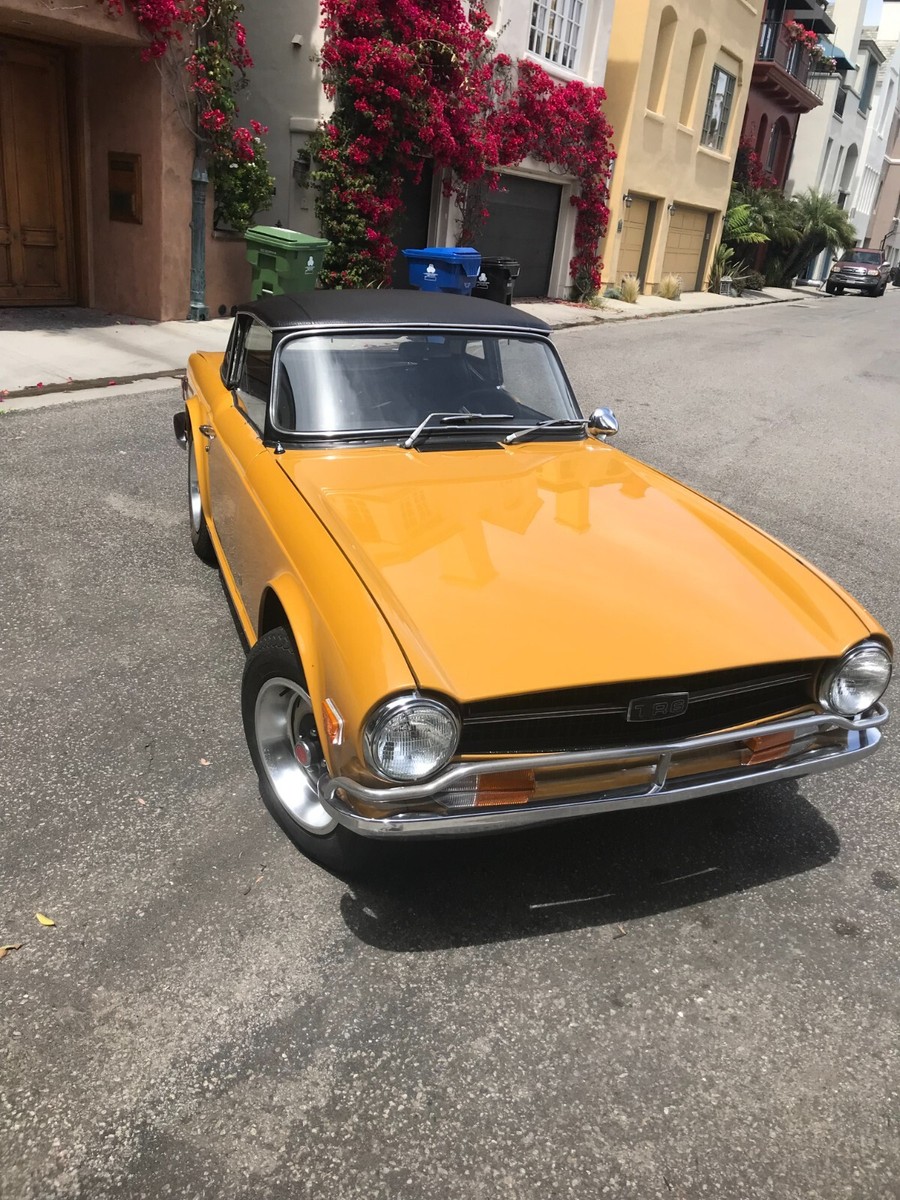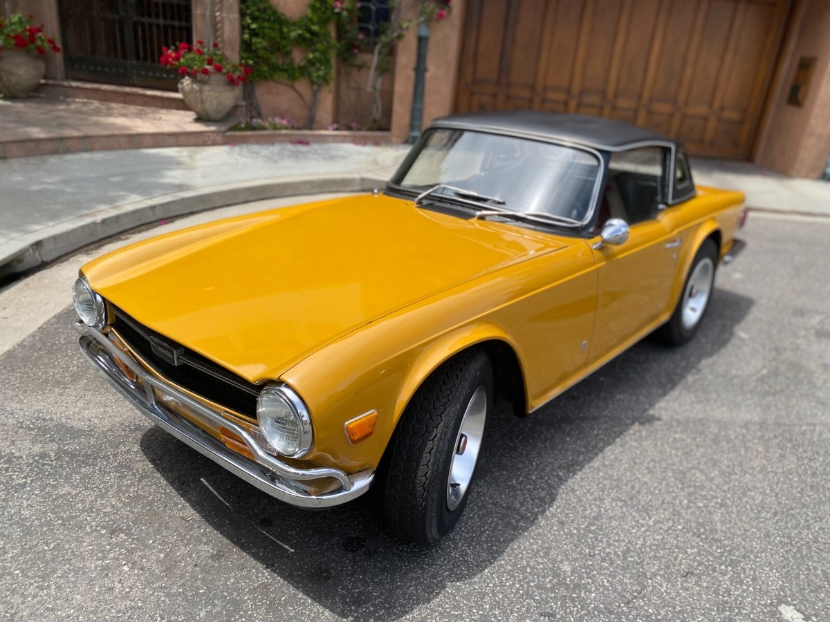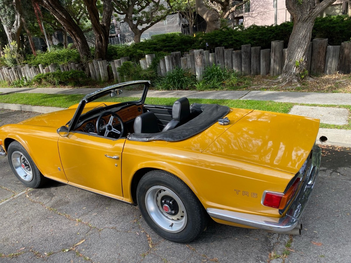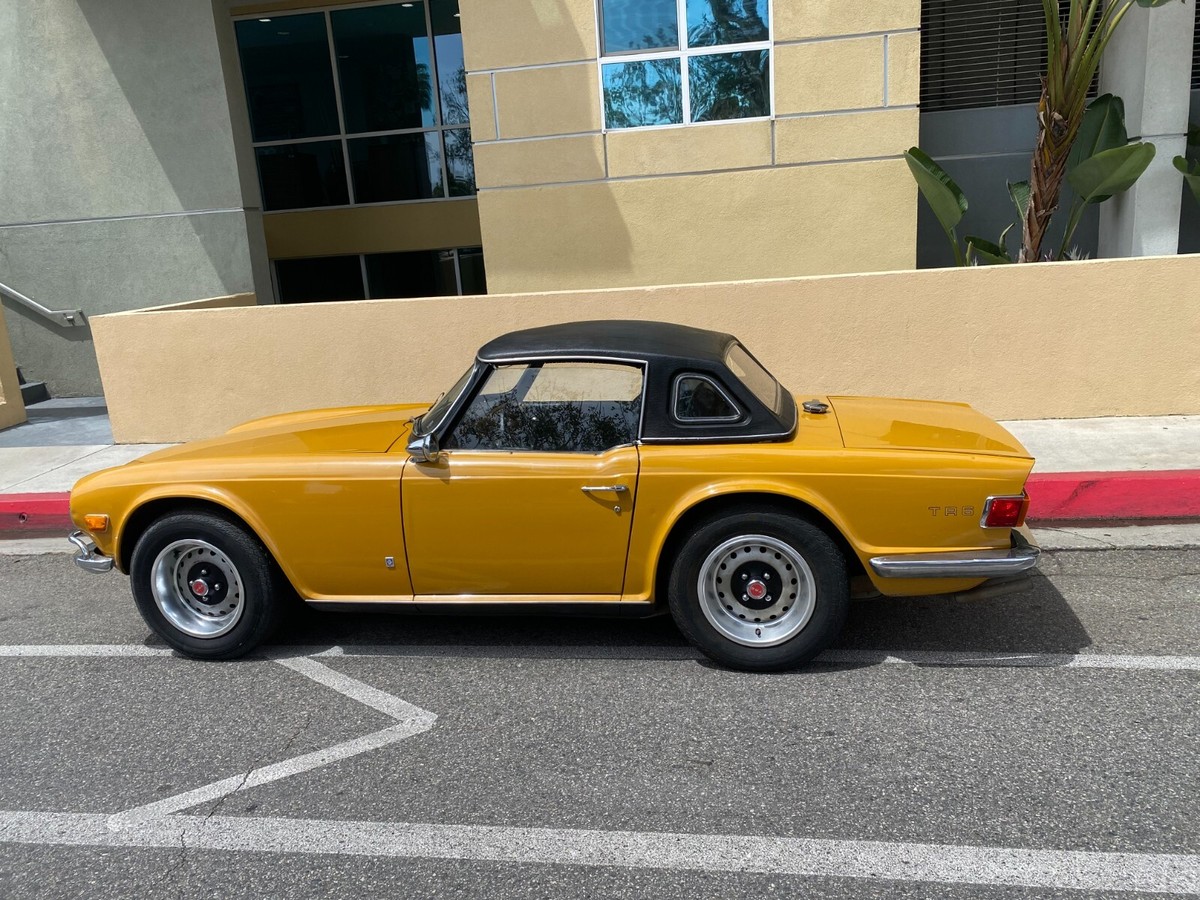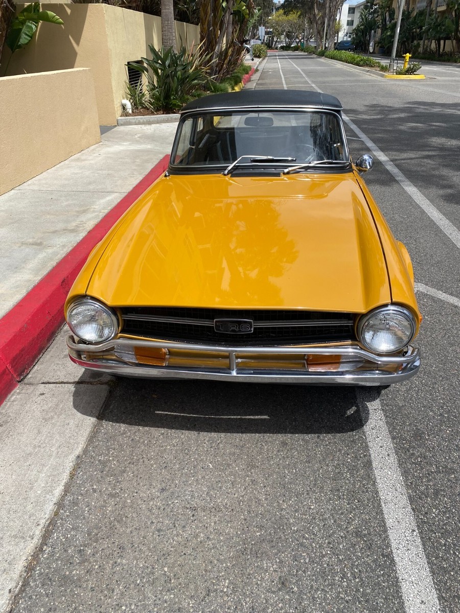 1972 Triumph TR6 RoadsterThis is a exceptional TR6. It is a California, rust free example. It has its original finish, Saffron yellow, that has never been in any accident. This is not a repaint, accident or rusted out, re-done vehicle. This is a original, desirable chrome bumper model (without the ugly rubber bumper overrides) with front chrome bumper guard. Original finish; never been re-sprayed and still beautiful. This TR6 runs and performs as well as it looks. Starts easy, idles smooth, runs cool, great oil pressure, and drives and performs as one should. It does not smoke, leak, or knock. It shifts effortlessly and brakes nicely. No funny noises! Complete with new convertible top, top boot, tonneau cover, and hard top. Always a "thumbs up" when driven. Arguably, the TR6 is the best Triumph ever made and most fun to drive. Great investment. Current California registration, with Clean California title.A 1000.00 non-refundable deposit, via PayPal, Venmo, or Zelle, is due within 48 hours at end of auction. Balance is due within 7 days.I have tried to describe my TR6 accurately, and to the best of my ability. If you have any questions or would like a inspection, PLEASE DO SO PRIOR TO BIDDING. Because of its age (54 years old) it is being SOLD AS-IS,WITHOUT WARRANTY, either expressed or implied.