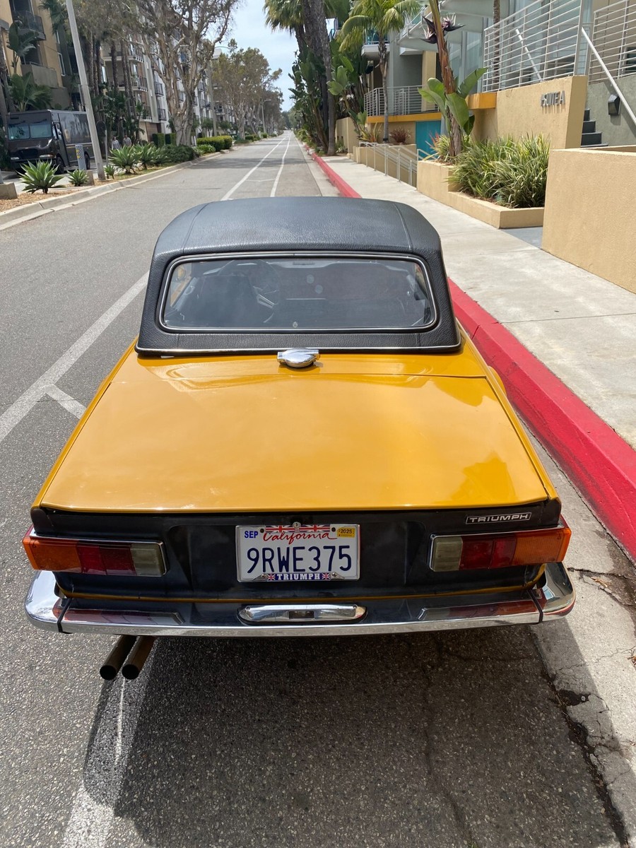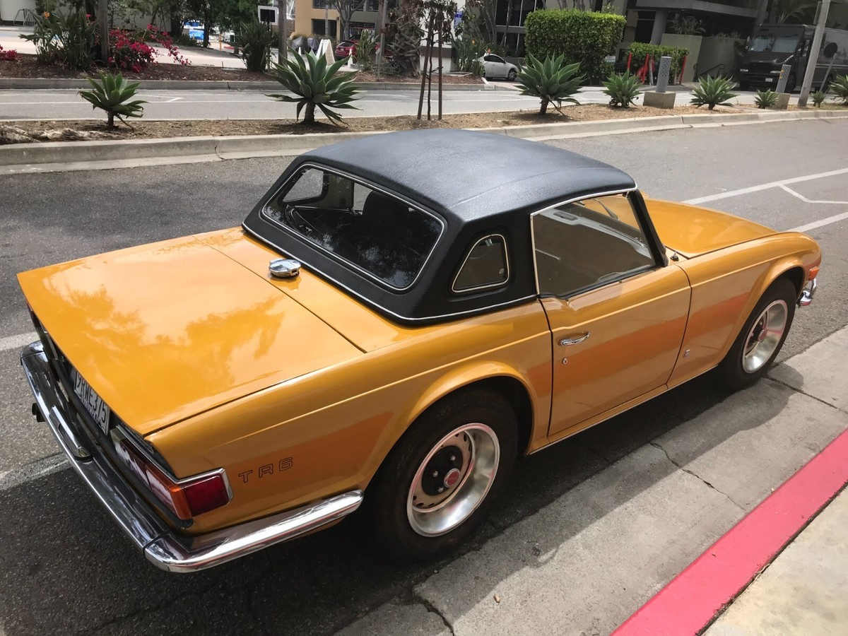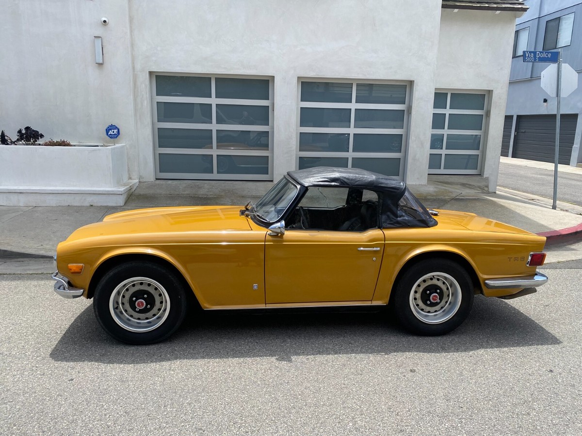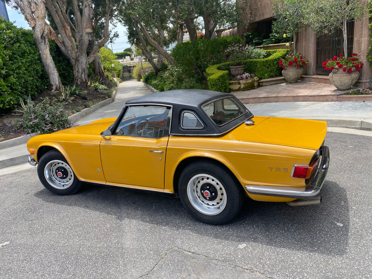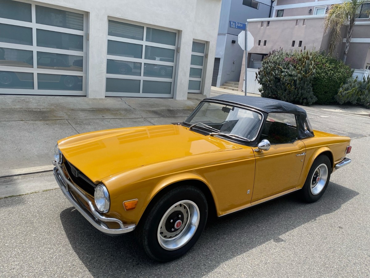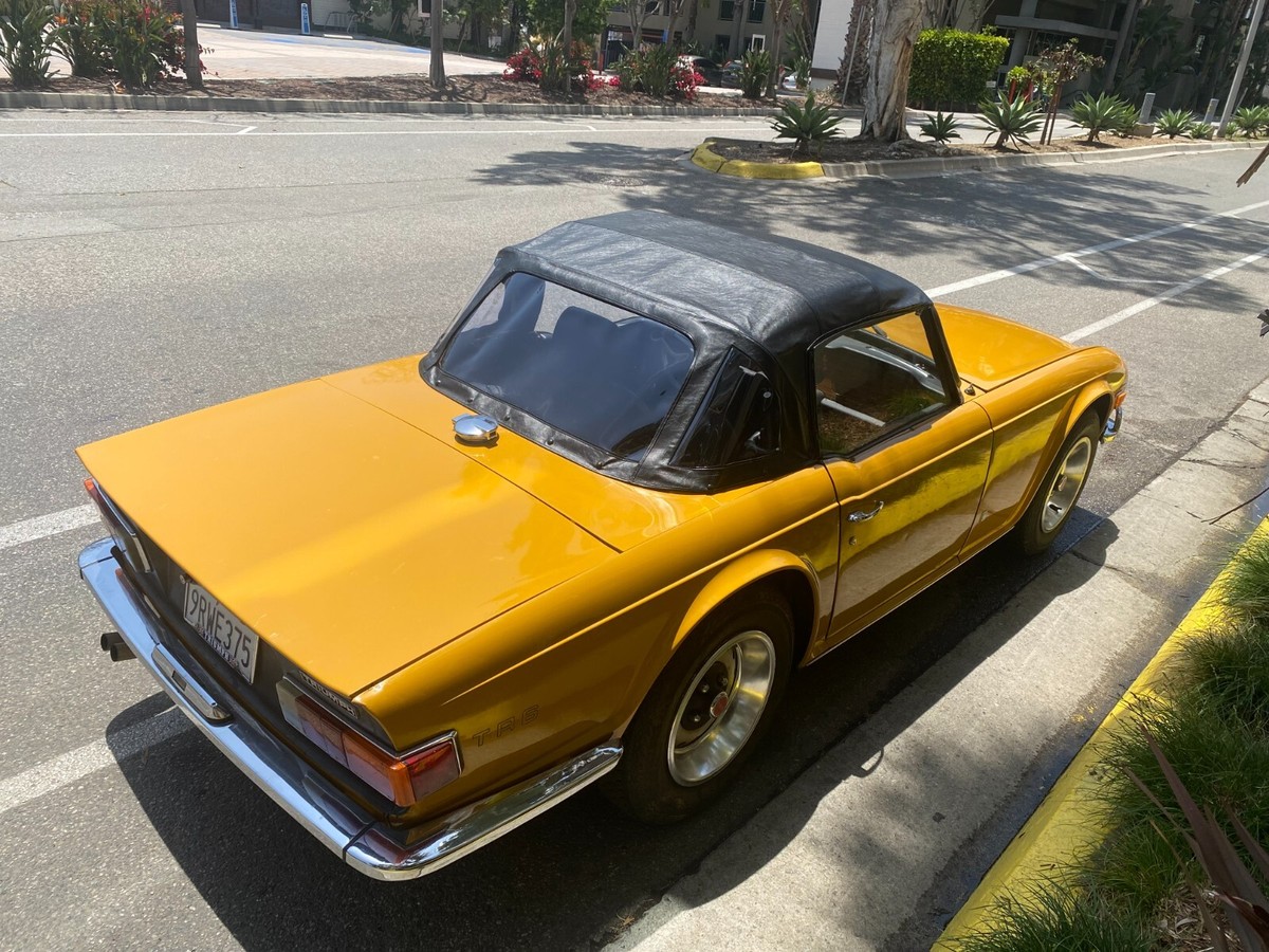 1972 Triumph TR6 RoadsterThis is a exceptional TR6. It is a California, rust free example. It has its original finish, Saffron yellow, that has never been in any accident. This is not a repaint, accident or rusted out, re-done vehicle. This is a original, desirable chrome bumper model (without the ugly rubber bumper overrides) with front chrome bumper guard. Original finish; never been re-sprayed and still beautiful. This TR6 runs and performs as well as it looks. Starts easy, idles smooth, runs cool, great oil pressure, and drives and performs as one should. It does not smoke, leak, or knock. It shifts effortlessly and brakes nicely. No funny noises! Complete with new convertible top, top boot, tonneau cover, and hard top. Always a "thumbs up" when driven. Arguably, the TR6 is the best Triumph ever made and most fun to drive. Great investment. Current California registration, with Clean California title.A 1000.00 non-refundable deposit, via PayPal, Venmo, or Zelle, is due within 48 hours at end of auction. Balance is due within 7 days.I have tried to describe my TR6 accurately, and to the best of my ability. If you have any questions or would like a inspection, PLEASE DO SO PRIOR TO BIDDING. Because of its age (54 years old) it is being SOLD AS-IS,WITHOUT WARRANTY, either expressed or implied.