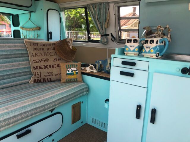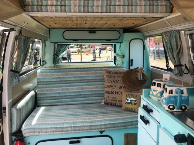 INTERIOR: The interior is all new except for the original Westfalia furniture. A brand new complete tan carpet kit was installed throughout the entire VW from front to back. We re-painted the furniture to go with the theme of the bus. If you are looking for a bright and fun interior, you will love this look! Custom bamboo headliner and accent pieces were installed throughout the bus to give it a beachy vibe.NEW!Front bucket seat covers, door panels, kick panels, sun visors, rear view mirror, window cranks, heater knobs, Bluetooth radio and door speakers, all foam pads were recovered with new fabric.The Z bed works great and folds down into a bed and the bunk up top was recovered as well. This bus originally came with gas powered stove but we decided to unhook the stove so it is currently not functional. We do have the original propane tank that goes under the bus. It will be included with the bus. The power hookup (inverter) was all removed as well as the refrigerator for more storage space by the previous owner.