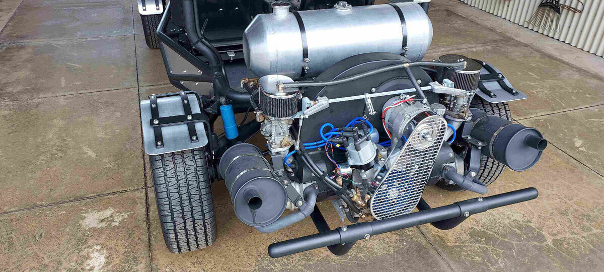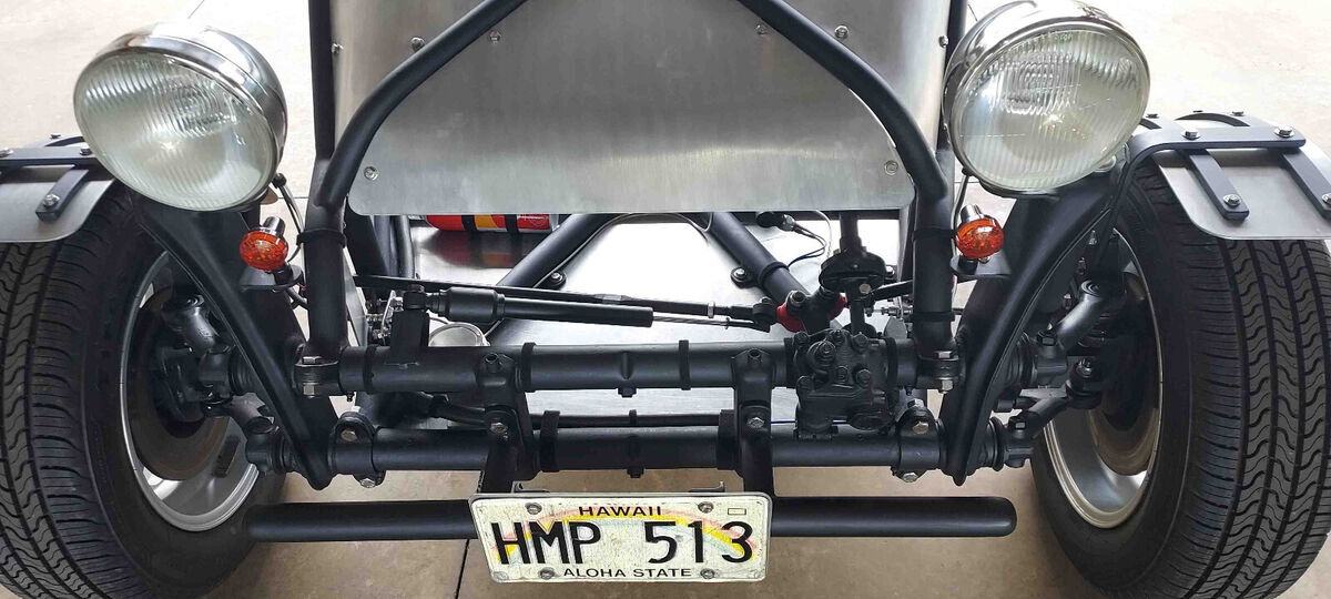 The engine/transaxle, mounting horns, front suspension tubes, steering box, pedals and parking brake are from the original pan. All the rest of the car’s suspension and steering gear is assembled from new parts.