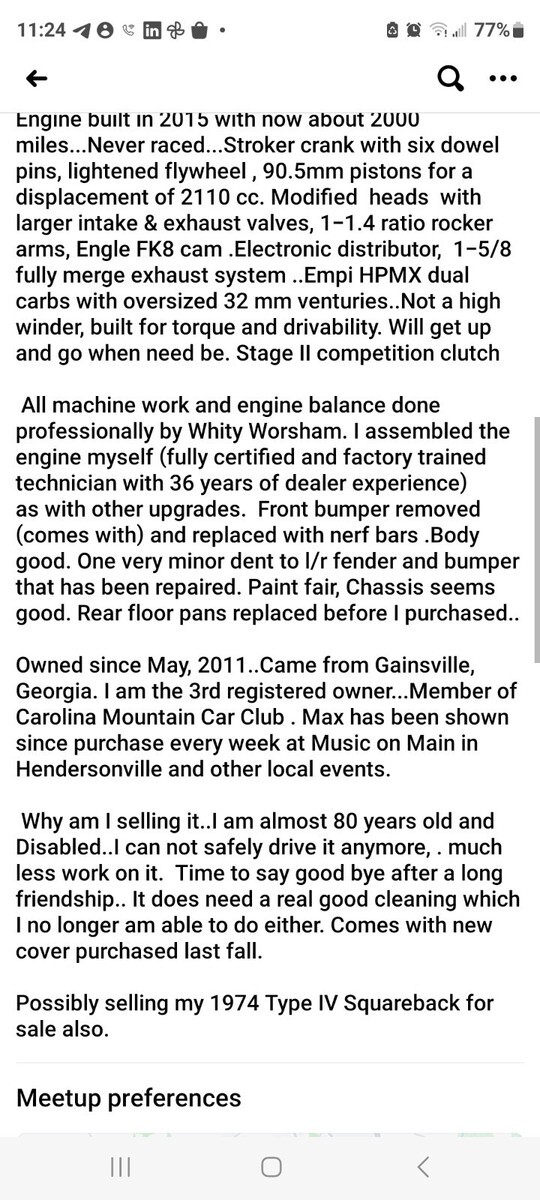 This is a very clean well built, 1974 vw bug. Owned by a master vw mechanic who built thos car into what it is today. Owner is the president of a car club. Car was featured in a magazine and photo shoot by none other than lance Armstrong brother. Car is in excellent shape and not rusted out. Engine is a 2110cc, dual carbs, runs like a Porsche and not your typical bug. Built for driveability. Will easily go 75mph, but 90 is not out of the question. Exterior is considered to be in great condition, and interior is also in great condition. Everything works great. Has a plug in heater for winter. Does not have heat channels installed. Comes with tow bar to where all four wheels can easily be towed behind any hitched vehicle. Car runs excellent. Feel free to ask any questions or look at the picture with details of build.