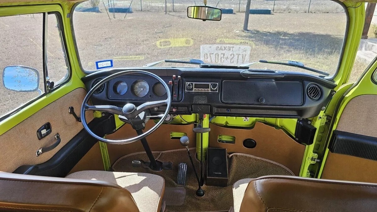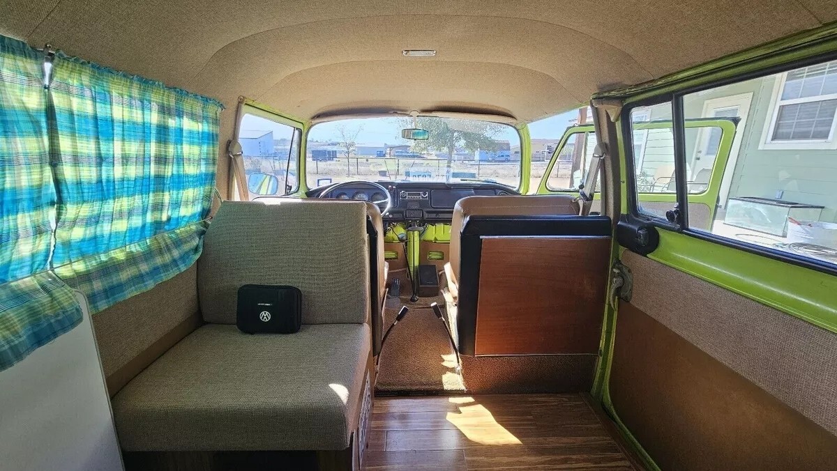 This 1973 Volkswagen Transporter has been lovingly restored with updated interior details, making it a comfortable and stylish vehicle for its owner to enjoy. With only 19,338 miles on the odometer, this green vehicle is clean and ready for a new driver. The vehicle has been carefully maintained and is in great working condition, ready to embark on a new adventure with its next owner.