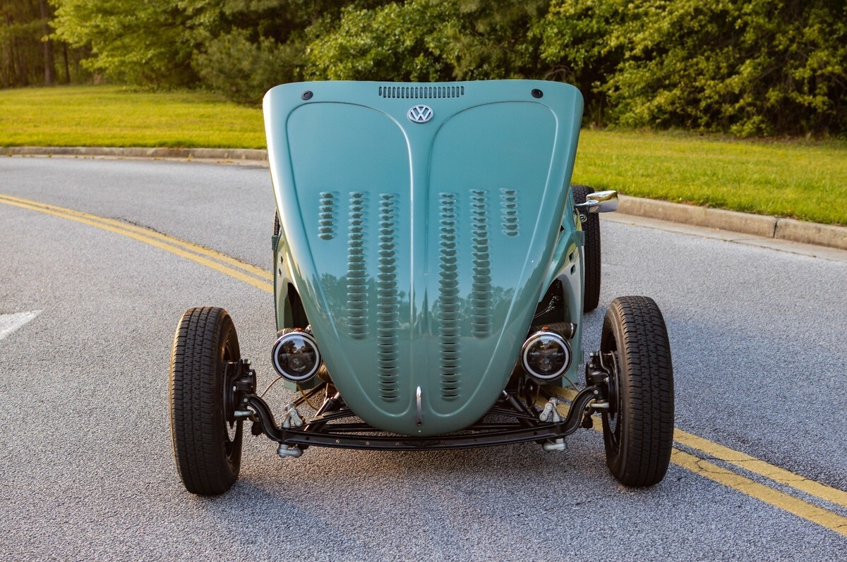 This wild custom started life as a 1969 Volkswagen Beetle and now rides as a chopped, channeled, V8-powered hot rod pickup. It blends a Beetle body with a ’49 Chevy cab, custom built bed, all mounted to a hand-fabricated steel frame with an integrated roll cage.