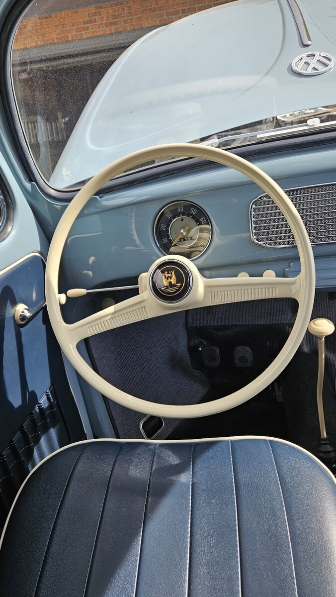 The restoration was completed to match the exact factory specifications shown on its official birth certificate, which is included with the sale. That includes a fully restored navy blue interior with off-white piping and a tan headliner, all brand new from Wolfsburg West.