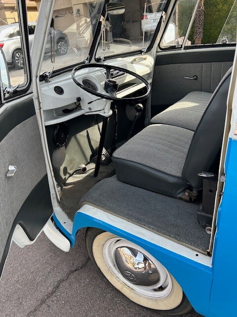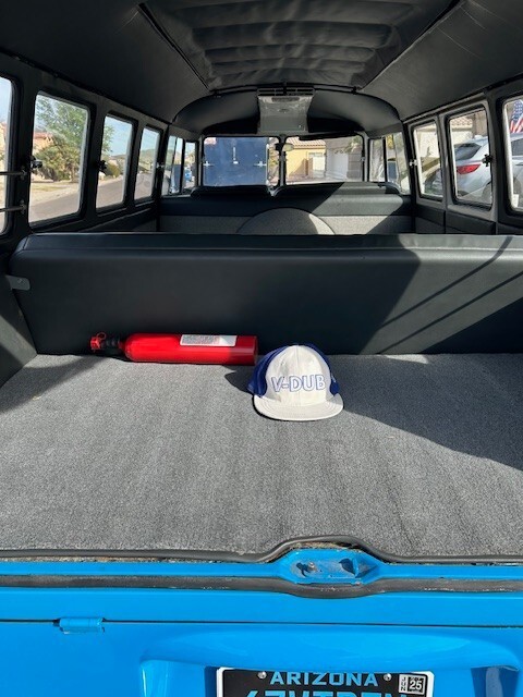 A standout feature is the aftermarket soft top roof, which opens for a breezy, open-air experience—perfect for sunny drives. Inside, you’ll find a spacious bench seat in the back, ideal for road trips or weekend adventures. This VW Bus is not just a vehicle; it’s a lifestyle, perfect for enthusiasts or anyone looking to own a piece of automotive history.