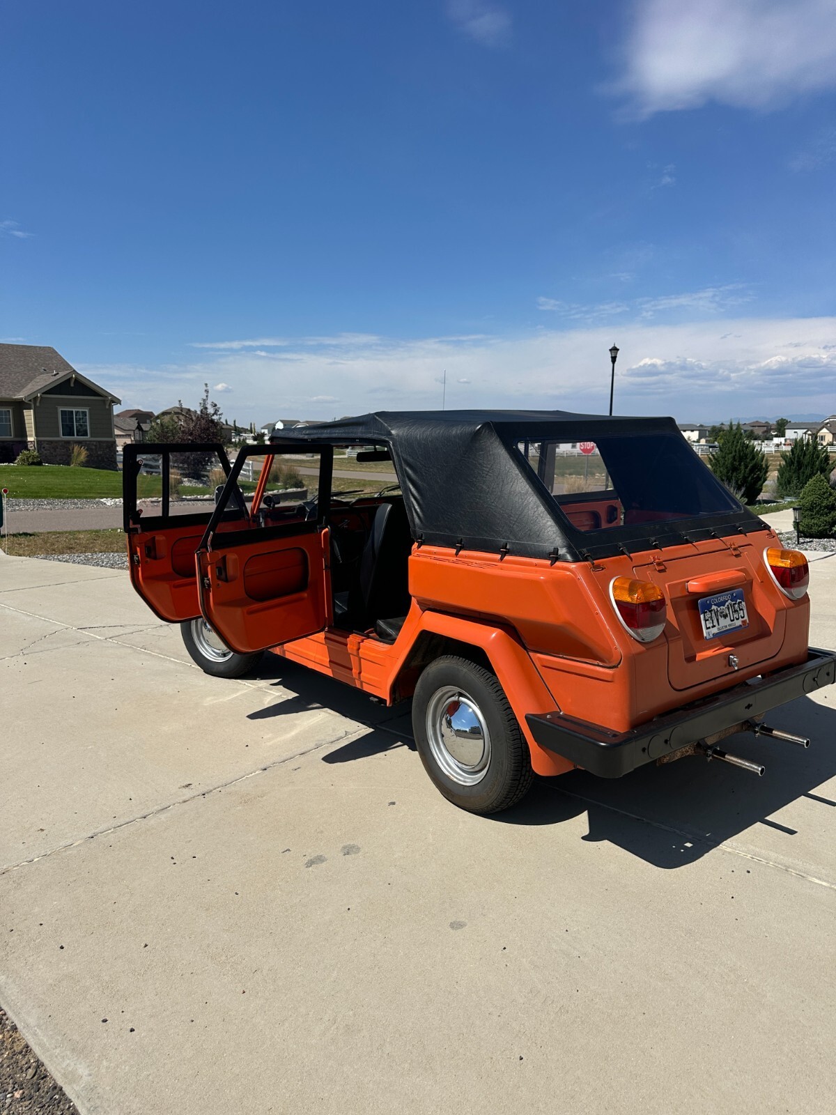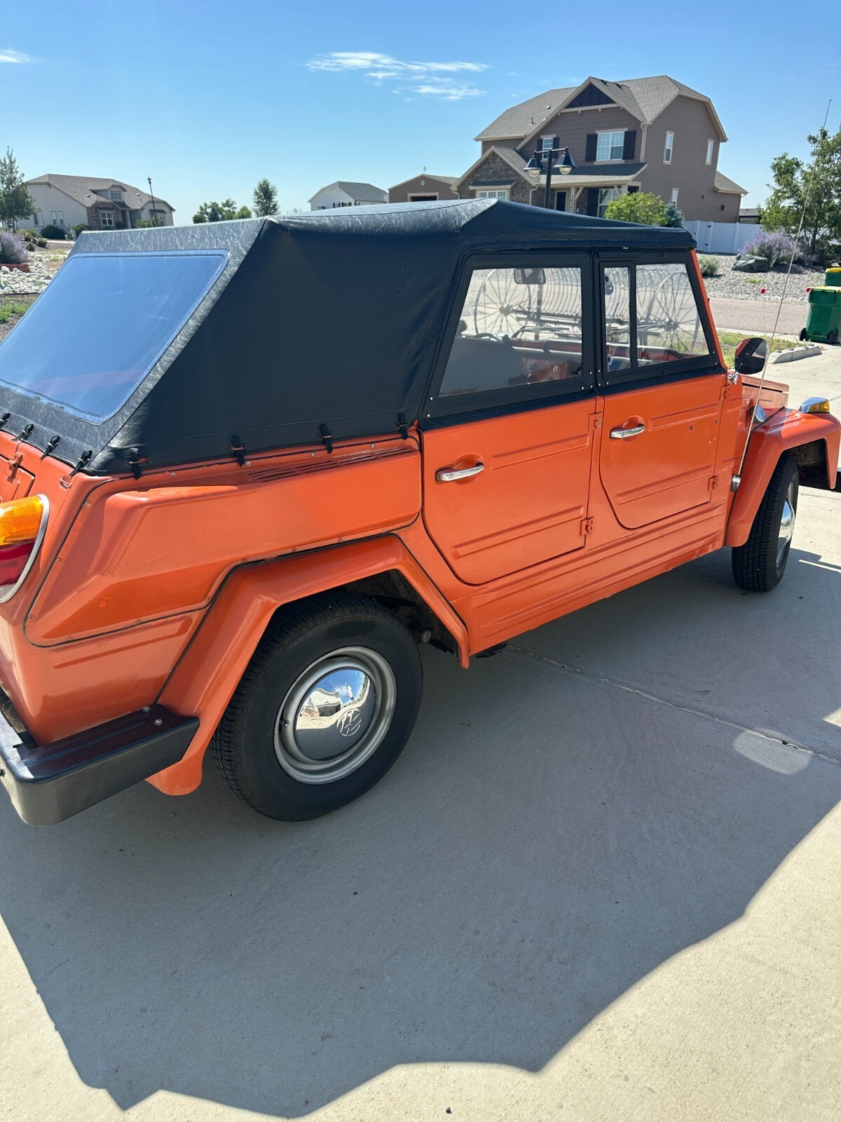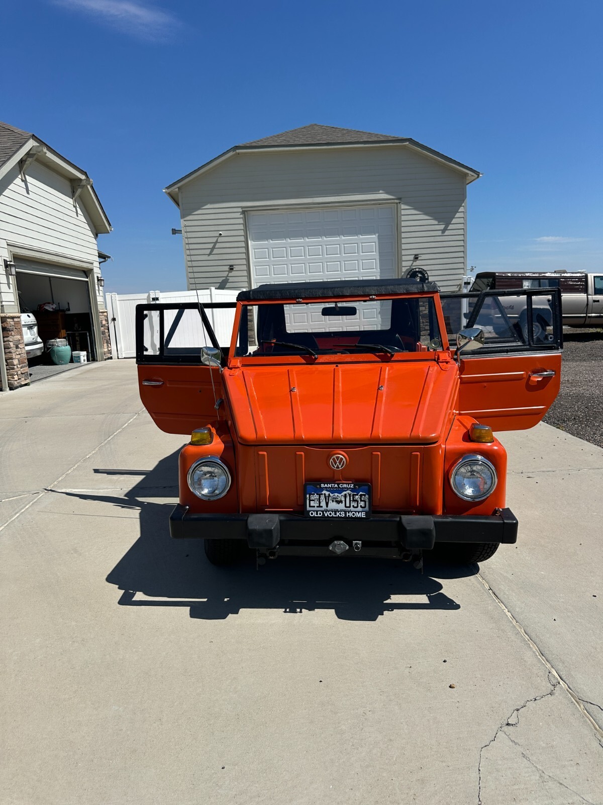 For Sale: 1974 Volkswagen Thing (181). Original Orange Paint and Hubcaps. 31987 miles (Odometer frozen at 31177 miles when we purchased vehicle in 2023). Lived 98% of its life on Central California Coast. Always garaged with no rust. Runs very well. So much fun to drive and pull behind an RV. A real attention grabber!