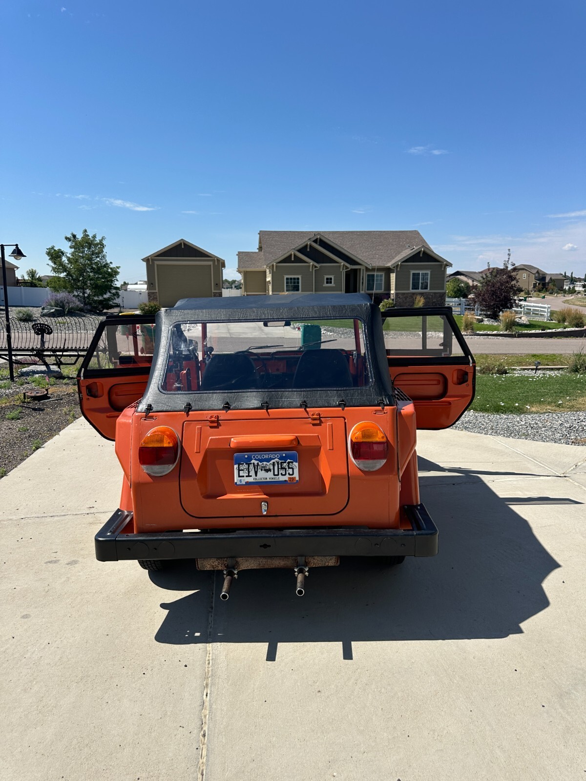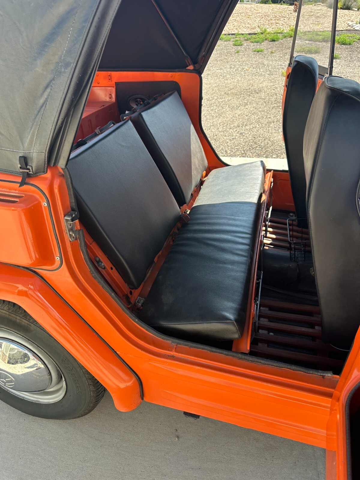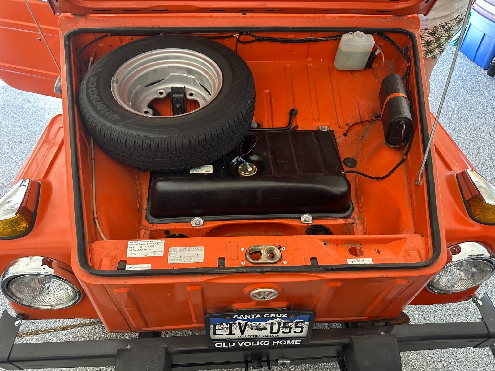 For Sale: 1974 Volkswagen Thing (181). Original Orange Paint and Hubcaps. 31987 miles (Odometer frozen at 31177 miles when we purchased vehicle in 2023). Lived 98% of its life on Central California Coast. Always garaged with no rust. Runs very well. So much fun to drive and pull behind an RV. A real attention grabber!