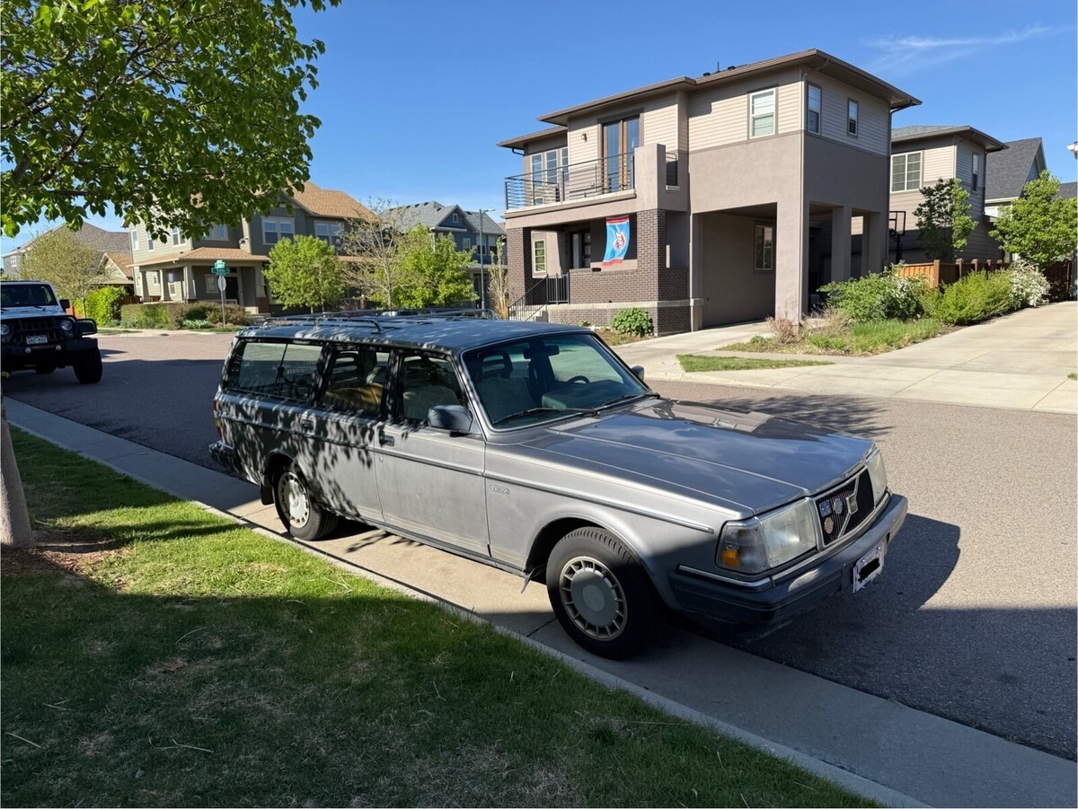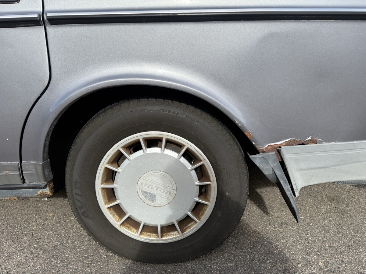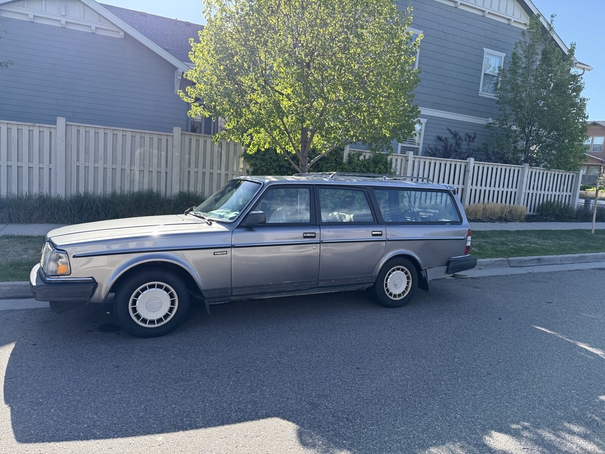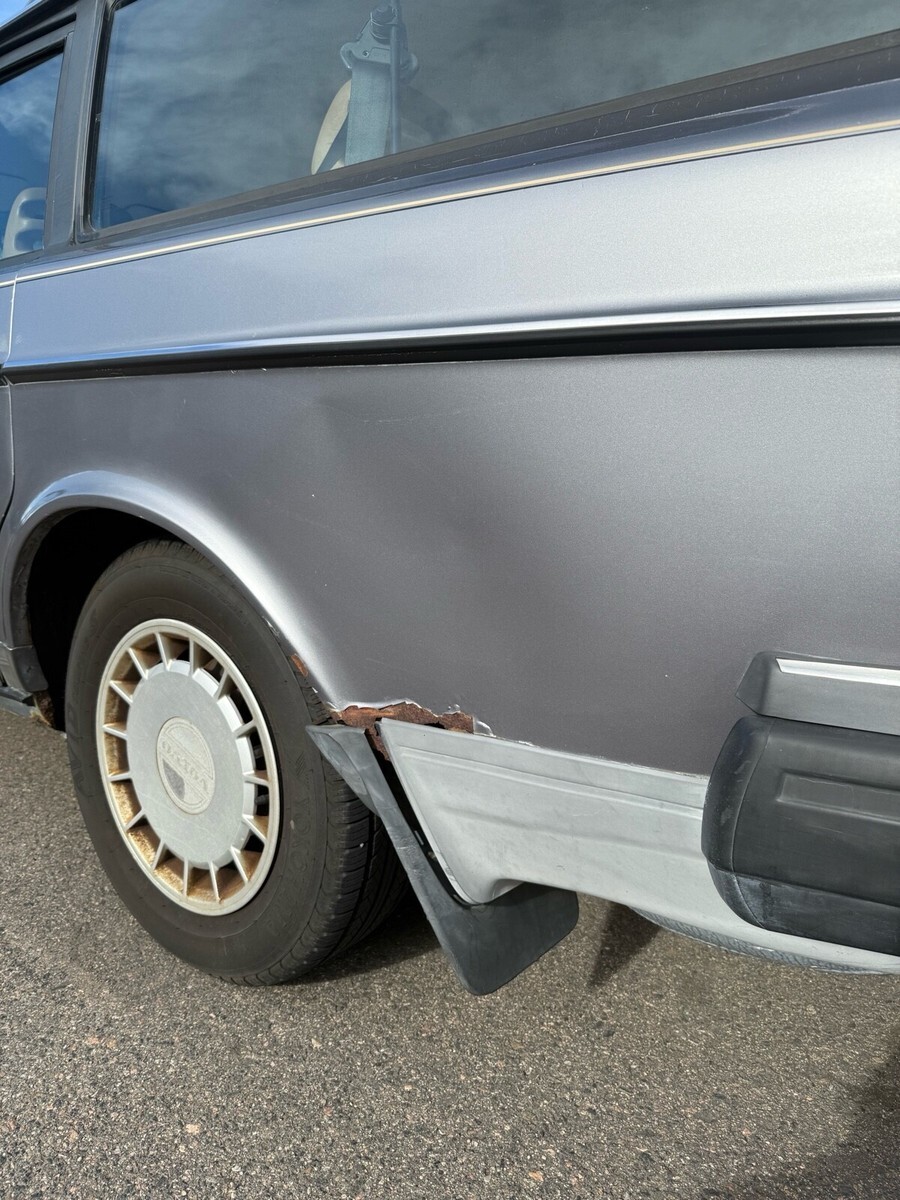 This 1989 Volvo 240DL wagon has been in my family for 36 years. It was regularly serviced and maintained. It was garaged for 30 years of its life. It’s still driveable but it’s starting to show it’s age and would be a great project for someone that is passionate about classic cars. Most of the parts are original. Tires are relatively new. Since trailering it out to Colorado in 2000 it’s been driven less then 1000 miles per year. The transmission is starting to slip which leads me to believe it will need some work in the near future to maximize its potential. Typically maxes out around 50 mph. The odometer stopped working at 306,636 and the engine likely has another 30,000 on it. The car still looks great but again is starting to show wear. In an effort to be totally transparent I am sharing pictures of items that are damaged/missing. The body has minimal rust, mostly at the base of the two rear tire wells. The hood experienced some hail damage last spring. The paint shows different signs of age based on two minor accidents over the years. Front leather seats show wear, currently covered with sheep skin.