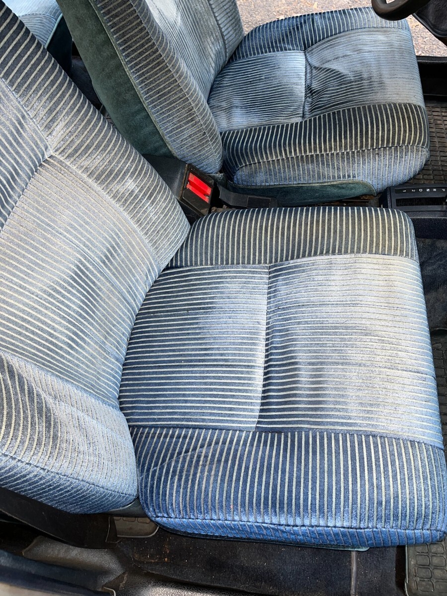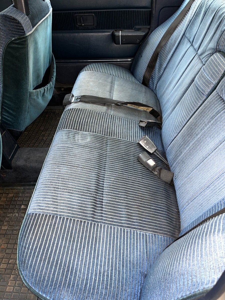 Interior is blue with upholstery code 4716. It's in good condition. Driver's door card has moisture damage.